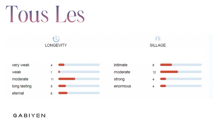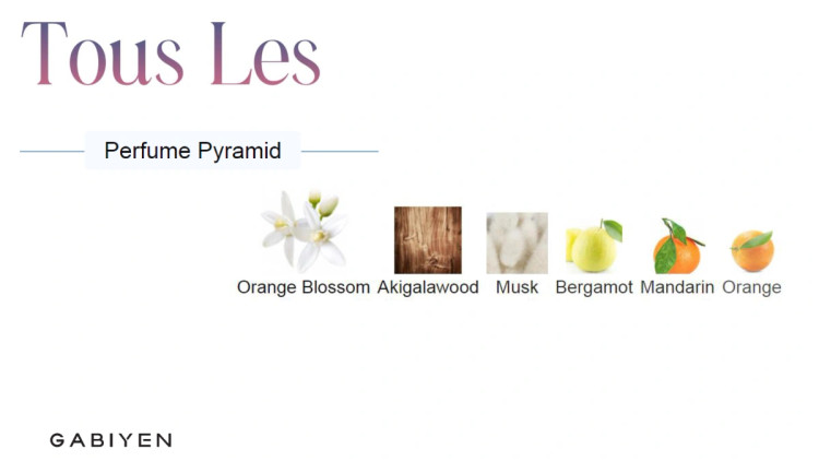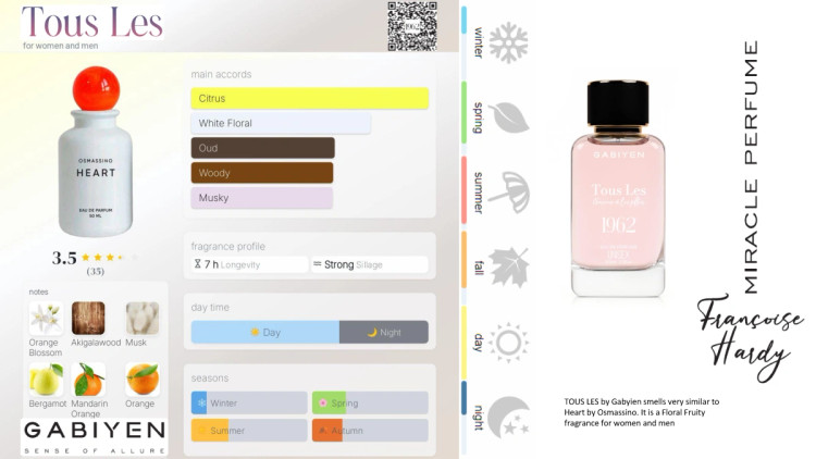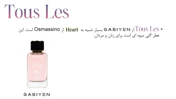 بوی TOUS LES از Gabyien بسیار شبیه به Heart by Osmassino است. این عطر گلی میوه ای است برای زنان و مردان.