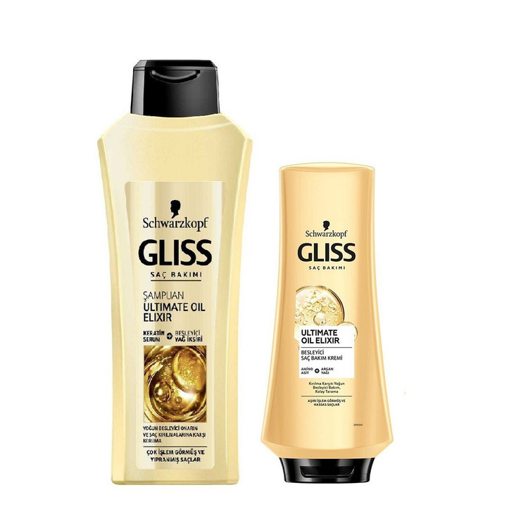 پکیج اقتصادی حاوی یک عدد شامپو کراتینه مو گلیس مدل Gliss Ultimate Oil Elixr و یک عدد نرم کننده مو گلیس مدل Gliss Ultimate Oil Elixr می باشد